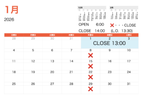 1月の営業日です☕️🩵 ❌がお休みとなります。 1日から3日までは6:00〜13:00までとなりますので、ご確認ください。 よろしくお願いします🌟